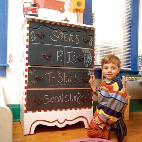 Alunga monotonia din mobilierul vechi al dormitorului copilului, oferindu-i un aspect nou si personalizat. Daca este in culori uni, fara imprimeuri, atunci poti improviza tot soiul de modele interesante pe el. Poti picta sertarele unei comode dupa bunul plac ori poti nota pe sertare categoriile lucrurilor care se gasesc in ele, pentru o mai buna organizare a acestora, dar si pentru un efect vizual autentic.