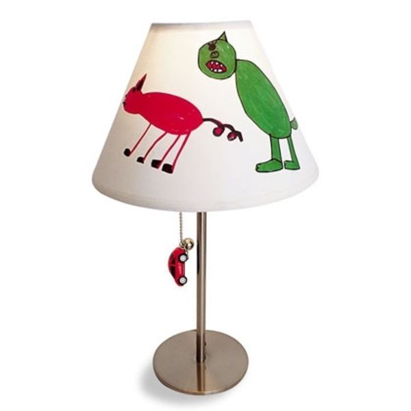 Cumpara o lampa obisnuita, clasica, cu abajur alb si personalizeaz-o cu pensula si vopsele industriale nontoxice, astfel incat sa se armonizeze cu decorul camerei copilului. Pentru un efect si mai special, ataseaza o jucarie de butonul de aprindere, astfel incat sa exprime si mai mult inocenta copilariei.