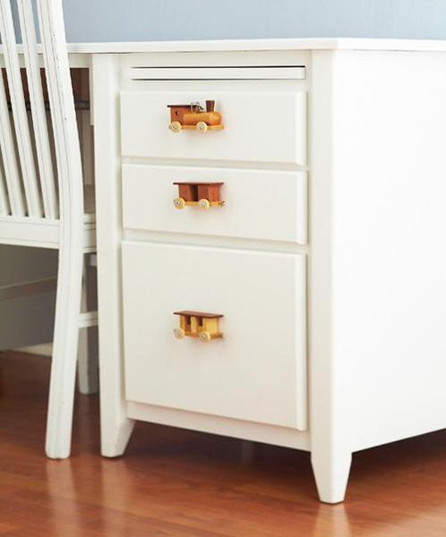 Transforma jucariile vechi de lemn ale copilului in cele mai ingenioase manere pentru mobilierul din dormitor. In felul acesta, reciclezi jucarii si oferi si un aspect decorativ original si ingenios mobilierului camerei.