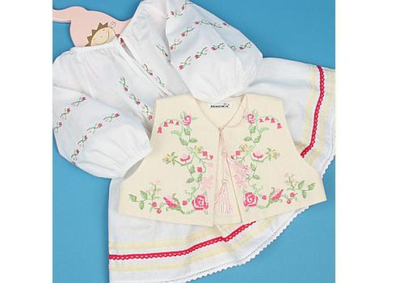 Creat din bumbac 100% si in culori calde si dragalase, acest costum popular simpatic va oferi o nota autentica tinutelor fetitei tale. Este format din ie, fustita si vestuta. Piesele costumasului pot fi purtate si separat, in combinatii cu alte hainute din garderoba micutei tale. Costumasul se poate face pe comanda pentru fetite de orice varsta.