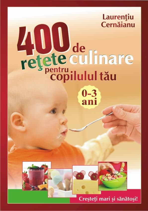"400 de retete culinare pentru copilul tau 0-3 ani" este un ghid complex si util privind alimentatia copilului 0-3 ani, atat in familie, cat si in colectivitati, cuprinzand: - notiuni de gastronomie, deosebit de utile in prevenirea si corectarea unor greseli de nutritie; - peste 400 de retete de preparare a alimentelor, fiecare preparat avand calculata valoarea sa calorica; - 700 de meniuri zilnice proprii fiecarei grupe de varsta, urmarind asigurarea unei varietati cat mai largi, atat in ceea ce priveste componentele, cat si modul de preparare.