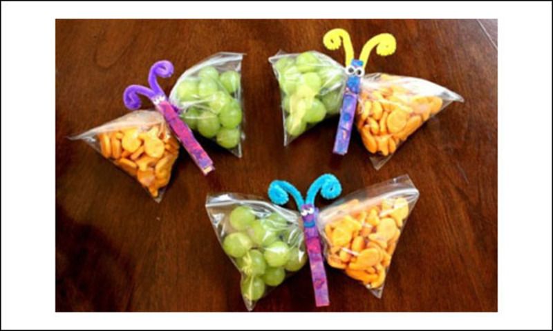 Serveste fructele si oleaginoasele copilului in forme cat mai interesante si originale, astfel incat sa le manance cu mai mult drag. Cumpara pungulite mici, care au inchidere tip fermoar, si agrafe sau carlige de rufe in forma de fluturasi. Umple fiecare pungulita mai intai cu fructe, apoi completeaz-o cu migdale. La mijloc, separa cele doua tipuri de alimente cu un carlig, astfel incat punga sa se transforme in doua aripi de fluture.