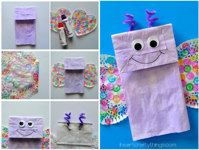 Iata o modalitate ieftina de a transforma simple pungi de hartie in mici obiecte de artizanat. Nu ai nevoie decat de sarma plusata, hartie decorativa, lipici, ochisori din plastic si o carioca neagra. Decupeaza mai intai aripile fluturelui din hartie decorativa si lipeste-le de o parte si de alta a pungii. Lipeste apoi ochisorii pe fundul pungii si confectioneaza doua antenute din sarma plusata rasucita, pe care sa le fixezi cu adeziv in capatul pungii. Deseaneza apoi o gura zambitoare si da viata fluturasului din hartie.