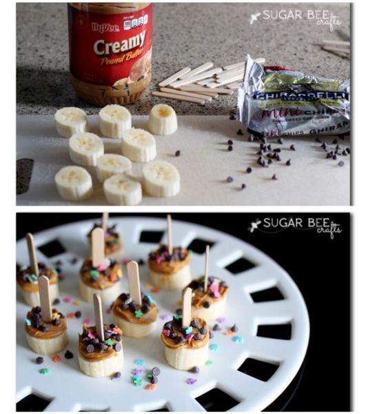 Pentru acele zile in care pur si simplu nu mai stii ce gustari sa le oferi celor mici, iti venim in ajutor cu o retete delicioasa si usor de facut: banane cu unt de arahide. Ai nevoie de unt de arahide, 1-2 banane taiate in bucati, ornamente pentru prajituri sau fulgi de ciocolata, betisoare de inghetata (optional). Intinde unt de arahide pe fiecare feliuta de banana si presara ornamentele pentru prajituri sau fulgi de ciocolata peste ele.