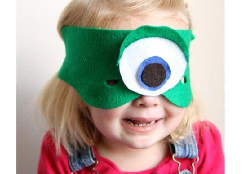 Aceasta masca pentru copil se face foarte repede, in doar 10 minute, si necesita doar cateva ustensile si materiale. Ai nevoie de mai multe bucati de fetru - verde, alb, albastru si negru - foarfeca si lipici. Taie fetrul verde in forma de masca venetiana si decupeaza ochii, apoi, ataseaza ochiul mare in mijloc, format din bucati de fetru alb, albastru si negru. Ai grija sa prinzi doua panglici de partile laterale ale mastii, pentru a facilita prinderea ei. Poti opta si pentru un sistem de prindere "mos si baba" ori nasture, dupa preferinta.