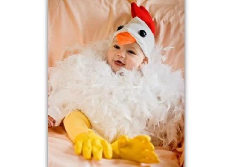 Imbraca body-ul ales pentru copil in fulgi albi, pana cand devine pufos. Ataseaza fulgisorii pe body cu lipici. Apoi pregateste capul de cocos, atasand pe fes un cioc din fetru portocaliu, ochi negri din nasturi si o creasta din fetru rosu sau dintr-o bucata de manusa rosie, umpluta cu vata si cusuta pe margini. Imbraca apoi copilul in body, pune-i caciulita, si baga-i piciorusele pe cele doua manusi. Prinde-le usor cu un elastic de coapse, pentru a sta fixe de picioruse.