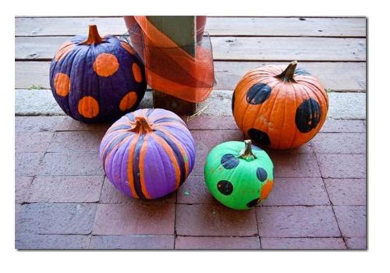O alta metoda simpla de decorare a dovleacului se face cu ajutorul pensulei si acuarelelor. Pictati toata suprafata dovleacului intr-o singura culoare. Apoi, din loc in loc, pictati buline de diferite dimensiuni, avand grija sa fie in culori contrastante celei de fond.