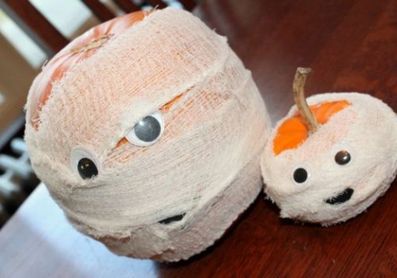 Transformati dovleacul intr-un cap de mumie. Infasurati-l bine in tifon sau pansament. Lasati un mic spatiu liber, pentru atasarea sau pictarea ochilor. Nu exista o metoda mai simpla de decorare a dovleacului, care sa aiba un efect atat de spectaculos in decorul casei de Halloween.