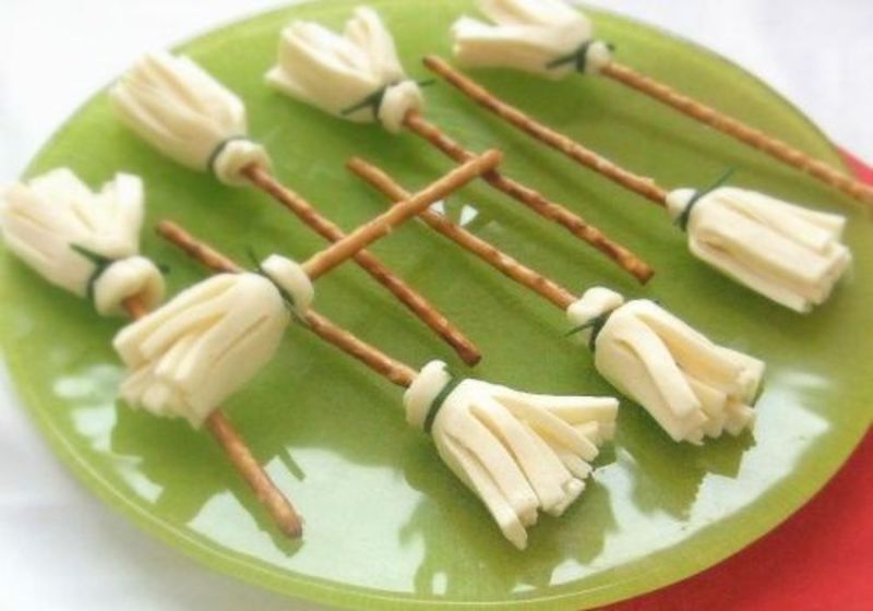 Ia fiecare minge de mozarella si modeleaz-o astfel incat sa formezi o lopetica. Leaga fiecare lopetica la capat cu fir de patrunjel si franjureaz-o in partea opusa, pana cand obtii formezi un fel de mop sau matura. Apoi, infige incet si cu atentie fiecare sticks in coada maturii.