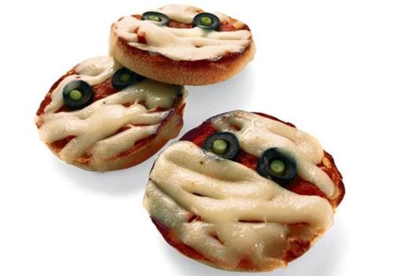 Prepara aluat de pizza si imparte-l in mai multe bucatele, astfel incat sa formezi cercuri mici. Intinde-le si asaza-le in tava, apoi unge-le cu sos de rosii. Pune cate doua rondele de maslina fiecarui cerc, pe post de ochi, iar in mijlocul rondelelor cate o bucatica mica de ceapa sau ardei verde. Pune apoi fasii de mozarella deasupra si dedesubtul ochilor. Este important sa nu acoperi ochii cu branza daca vrei ca la sfarsit, sa obtii aspectul unor mumii.