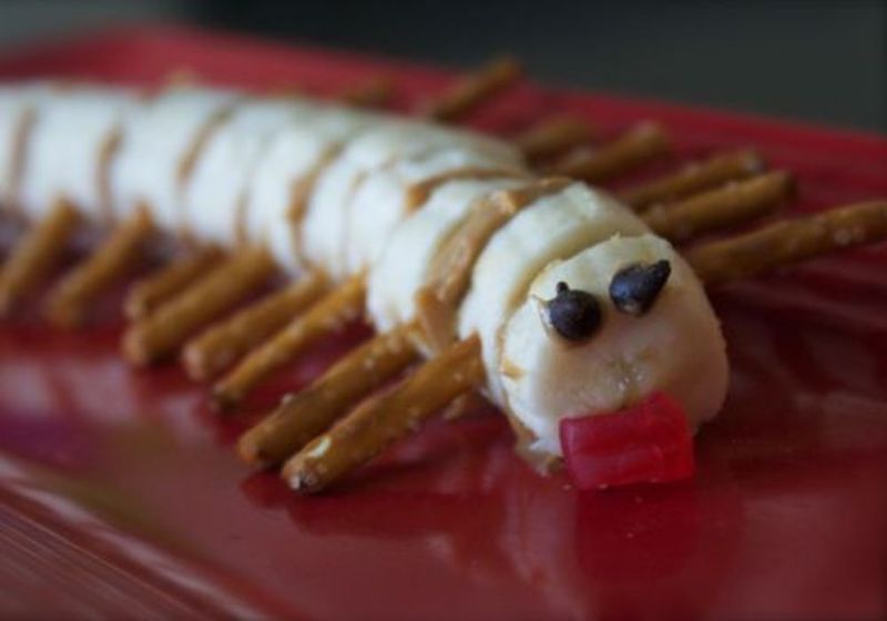 Asaza rondelele ca si cand ai incerca sa reconstruiesti banana, dar ai grija sa umpli feliile cu unt de arahide sau dulceata, pentru a le lipi intre ele, si sa infigi, in parti, cate un sticks de maximum 2 cm, pentru a forma picioare. Cand ai ajuns la capat, decoreaza ochii omizii cu stafide.