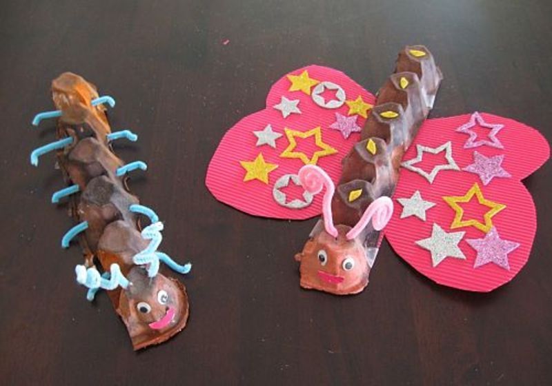Cofrajul de oua te poate ajuta si la crearea unui fluture decorativ, foarte simpatic. Decupeaza cartonul la fel ca pentru omida, pana iti ramane o parte formata din 5 locasuri lipite intre ele, pe lung. Separat, decupeaza doua aripi din hartie cartonata, suficient de mari cat sa poata fi alipite cofrajului si sa formeze, impreuna cu acesta, un fluture mare. Lasa copilul sa coloreze si decoreze cofrajul si aripile cu pensula si acuarele. Nu uitati sa decorati capul fluturelui cu antenute din sarmulite si ochi creionati cu o carioca.