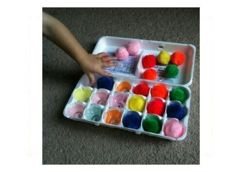 Cofrajul de oua poate deveni cu succes o tabla de joc care va tine ocupat copilul cateva ore in sir. Alege cartonul cu 30 de spatii de oua, care este si cel mai mare de pe piata. Cumpara si un pachet mare cu pampoane de mici dimensiuni, colorate in mai multe nuante. Apoi, pictati cu acuarele interiorul locasurilor pentru oua in fiecare culoare care se regaseste in pachetul cu pampoane. Rastoarna pampoanele langa cofraj si provoaca copilul sa le puna in spatiile corespunzatoare, in functie de culoare.