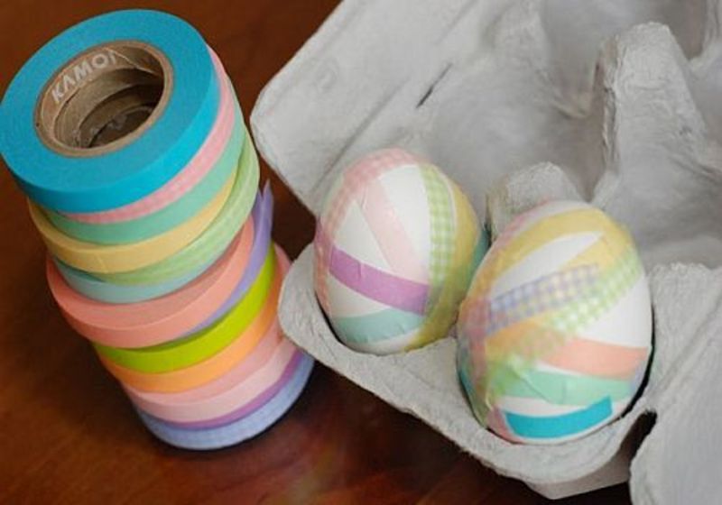 "Pansati" ouale de Paste, imbracandu-le in mai multe fasii de banda adeziva, in diferite nuante. Lipiti fasiile aleatoriu sau dupa un model prestabilit, de-a lungul si de-a latul oului, astfel incat sa ii acoperiti toate zonele albe, iar culorile benzilor sa se intrepatrunda armonios intre ele.