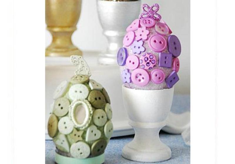 O alta idee deosebita de decorare a oualor de Paste, in acest an, este decorarea sau accesorizarea lor cu nasturi de diferite culori si forme. Imbraca initial ouale in sclipici in nuante deschise, pale, apoi selecteaza cu prichindelul tau, din cutiuta cu nasturi, toate formele si culorile asemanatoare si incepeti sa le lipiti pe oua, pana acoperiti toata suprafata lor.