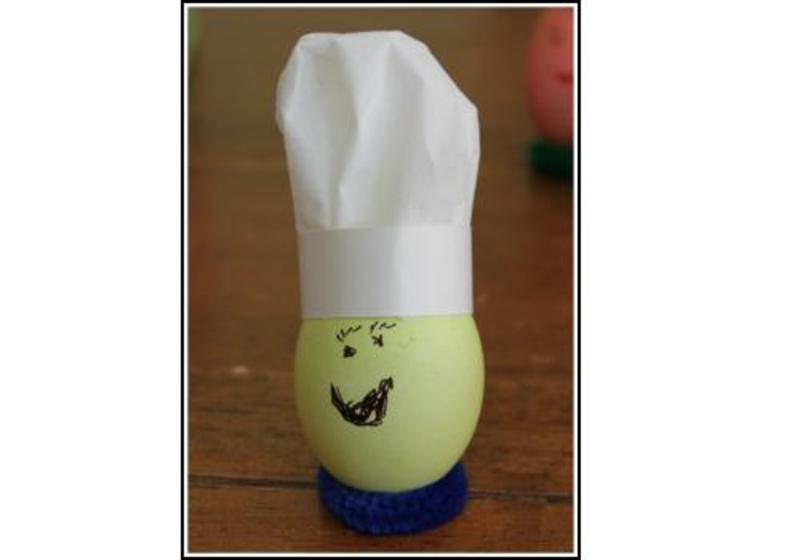 Boneta de bucatar pentru oua pare destul de dificil de creat, insa o poti simplifica, folosind servetel pe post de calota si o banda de carton pentru marginea bonetei. Mototoleste un pic bucata de servetel necesara pentru coiful bonetei, apoi strange-o in buchetel si lipeste-i marginile de banda cartonata, astfel incat calota sa stea cat mai infoiata.