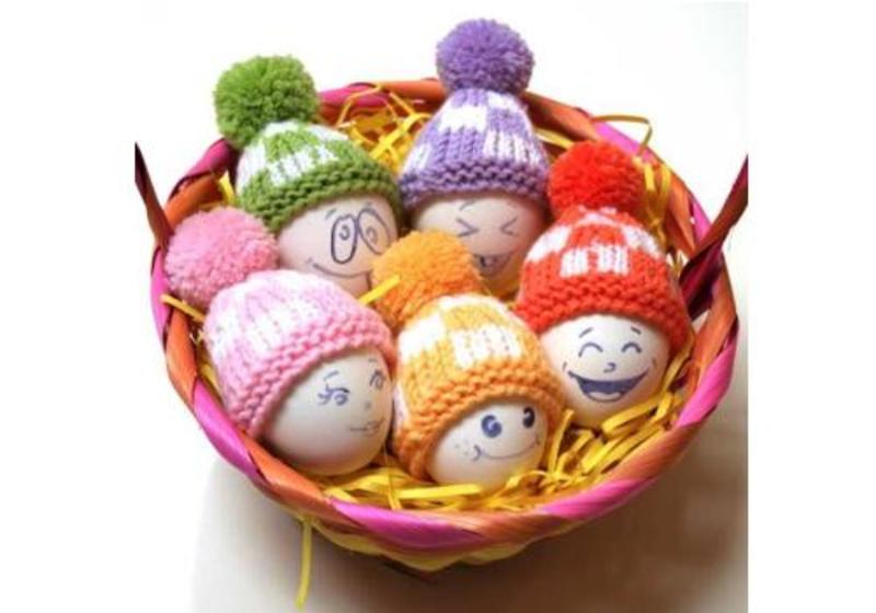 In cazul in care primavara joaca feste, iar vremea din perioada Pastelui este friguroasa si ploioasa, atunci ouale vopsite au nevoie de ceva mai gros pe cap decat o palarie de soare: o caciulita crosetata. In cazul in care te pricepi, croseteaza caciulita si fa-i si un mot, iar in cazul in care nu esti talentata la asa ceva, decupeaza un material mai gros, coase-l astfel incat sa aiba forma unei caciulite. Ataseaza-i si motul cu lipici.
