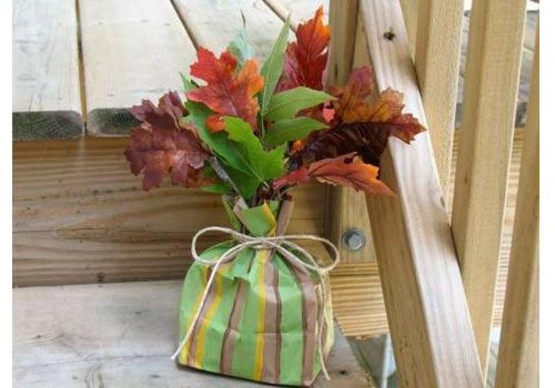 Cumpara-i copilului tau o vaza simpla, de sticla. Apoi mergi cu el in parc si adunati cat mai multe frunze sau crengute uscate, avand grija ca acestea sa aiba si codite, astfel incat sa poata fi facute buchet si introduse in vaza. Puteti pune frunzele asa cum sunt ele in vaza. Veti forma astfel o decoratiune simpla de toamna. Incurajeaza insa copilul sa fie mai creativ si sa personalizeze si mai mult craftul - pune-l sa creeze singur vaza sau sa o picteze pe cea deja existenta. Pentru ca buchetul sa aiba un efect si mai interesant, poate pune o pata de culoare, cu ajutorul acuarelelor, pe cateva dintre frunze.