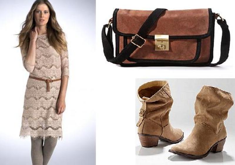 Rochie din dantela - 209 lei; Cizme din material textil - 209 lei; Geanta acoperita cu piele de vitel - 309 lei - Laredoute.ro