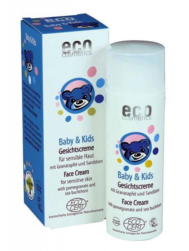 Crema fata bebe cu rodie si catina alba Eco Cosmetics cu extract de rodie organica ce ofera hidratare ampla fetei si mainilor, cu ulei de maslin si de catina ce protejeaza delicat, ulei din frunze de catina si din samburi de caisa ce calmeaza pielea iritata si sustin functiile epidermei.