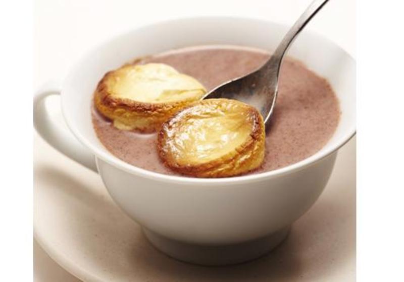 Amesteca pudra de cacao cu putin lapte, apoi toarna si restul laptelui si pune amestecul pe foc, la fiert. Toarna zaharul sau mierea. Atentie la cantitati, intrucat si laptele praf si bezelele sunt dulci. Coace bezelele in cuptor, pe hartie de copt, timp de 30 de secunde, la o temperatura crescuta, pana cand se rumenesc usor. Lasa cacaua cu lapte sa se raceasca un pic si apoi adauga laptele praf. Amesteca bine pana cand bautura se ingroasa putin. Toarna amestecul intr-o cana si pune deasupra bezelele coapte.