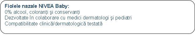 Solutia nazala NIVEA Baby a fost dezvoltata in colaborare cu medici dermatologi si pediatri fiind special creata pentru ingrijirea delicata a nasului, dar si pentru ingrijirea pleoapelor si curatarea ochisorilor bebelusului. Este ideala mai ales in cazul racelilor cand ajuta la eliminarea secretiilor nazale si hidrateaza mucoasa, decongestionand nasul, astfel incat bebelusul sa poata respira usor.